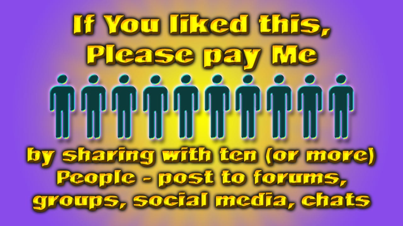 As My regular readers know, I ask for no money as payment for My work for Humanity. I ask for payment in shares. Please, if You feel My work has value, share with ten or more People. This will be the only way the information is spread.